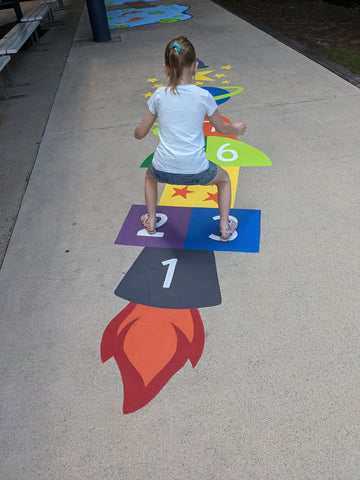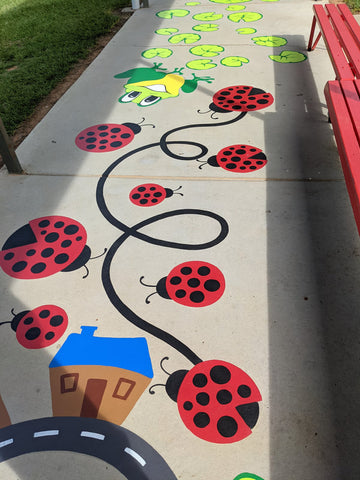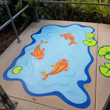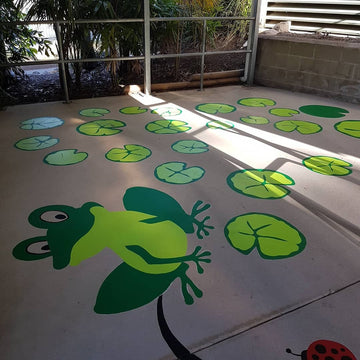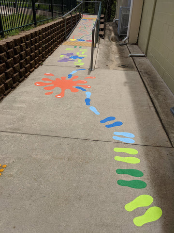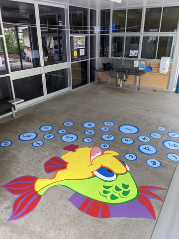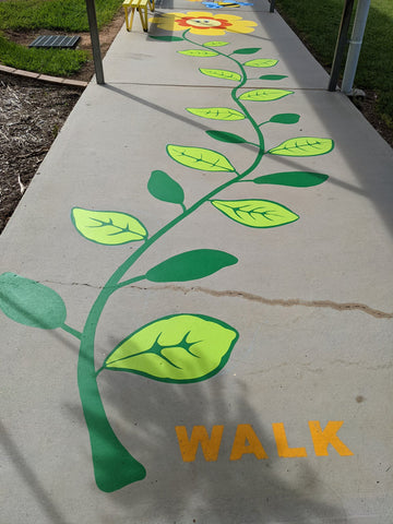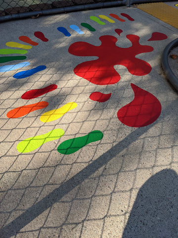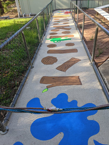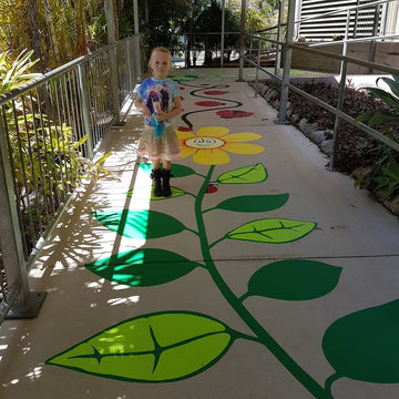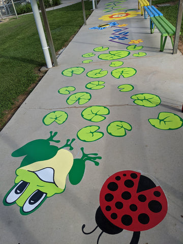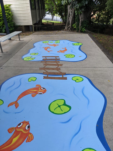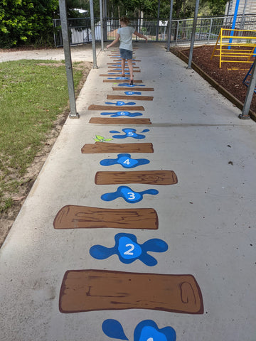 As part of my arts practice, I am currently working with schools to develop what I call ‘Sensory Pathways’. This involves a collaboration with a school community to create an engaging space for students to explore sensory development. Not only does it bring colour and life to what would be bland concrete pathways, it increases engagement for cognitive development, fine motor skills and imagination. It allows a space for teachers to work with children who may struggle with behavioral issues, giving an outdoor space to focus and learn. It gets the kids moving and active outside the classroom through counting, letters, balance, colour, and shape. These are all aspects that are focused on throughout the planning. I try to achieve the most engaging and relatable images for each school. I work closely with teachers to understand how we can work with curriculum and subjects to develop a design that suits them. Previous designs have included mazes, crocodile rivers with stepping logs, hand and feet balance bridges, Lily pads, Alphabet bubbles, and Number rockets and more. I believe this can be a really valuable project for our school communities and invites the arts and imagination into the minds of our kids and teachers today. Our schools are focusing on play so much more in the classroom especially with our younger generations. So many more children are being diagnosed with learning difficulties, and find it more engaging outside of the standard classroom. I feel strongly about trying to implement this for our students education today. I have included some reference photos to give you an idea of some previous projects. If this is something that you could see be apart of your school or community please get in contact and we can discuss options. I have included some information of the process below.