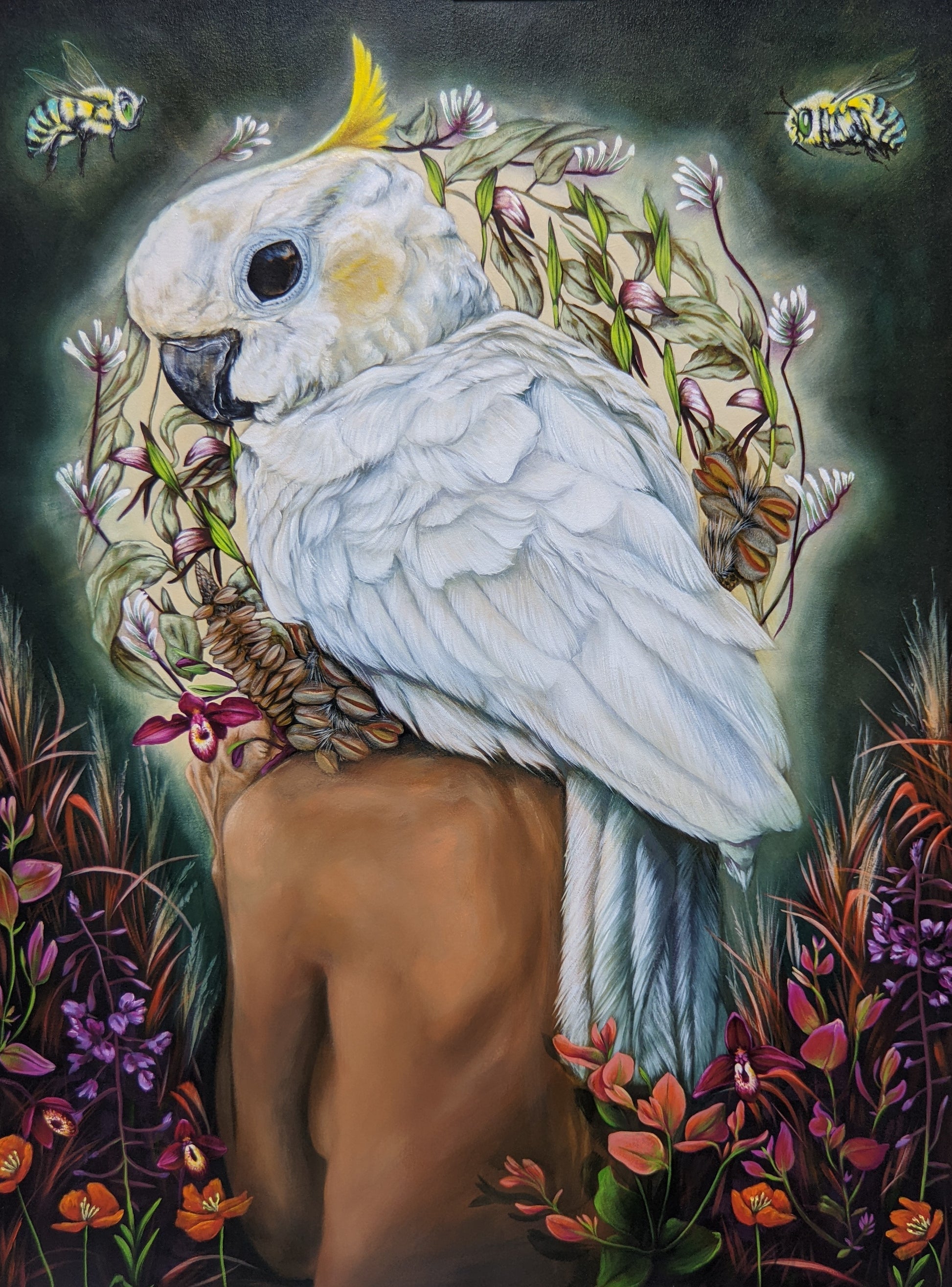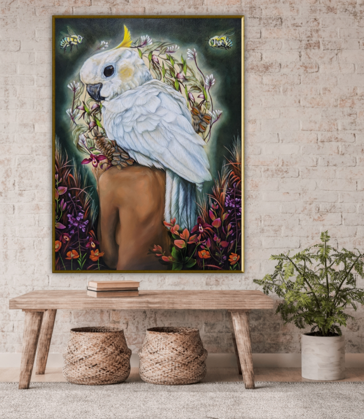 'Wild Fire' was created to honor the spirit that lives within nature and the power of rebirth after fire. Revered by our indigenous people, the white Cockatoo represents the element of fire and their role in landscape regeneration. They are thought to understand deeply the nature of life and death.